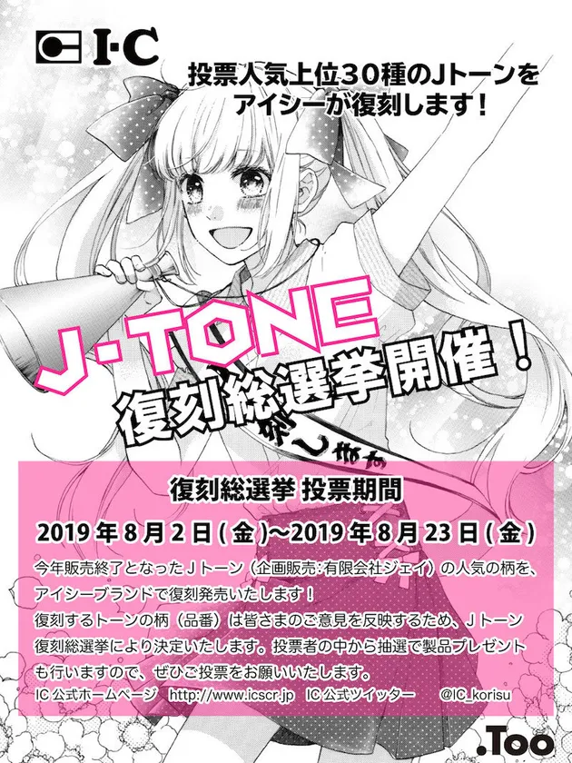 株式会社G-Too(所在地:東京都品川区、代表取締役:石井 剛太)は、販売終了となった人気画材「Jトーン(企画販売:有限会社ジェイ)」を買い取り、アイシーで一部の柄を復刻・新発売することを決定いたしました。