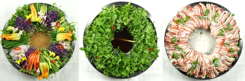 ベトナム料理らしく魚介類とたっぷり野菜を使ったヘルシーな鍋。現地でも花鍋は美容に良いので女性に人気です。ズッキーニの花やエディブルフラワーを始め、ズッキーニ、豆苗、水菜、紫キャベツ、海老、旬の白身魚など、具材を可愛らしく華やかに盛り付けることで“花”のイメージに。スープはトムヤムクンスープ、レモングラススープ、コムタンスープの3種類から選べます。魚介や野菜類をしゃぶしゃぶしていただきます。