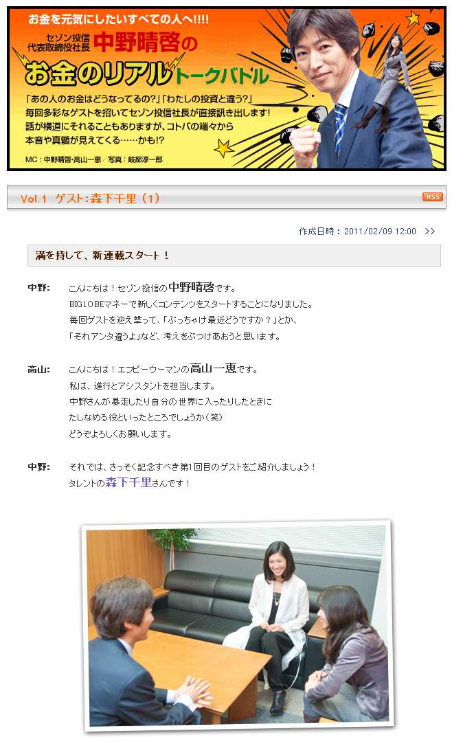 BIGLOBEは、金融・節約情報を提供する総合マネーサイト「BIGLOBEマネー」において、長期投資の専門家であるセゾン投信社長 中野 晴啓の対談コンテンツ「“お金のリアル”トークバトル」の提供を開始しました。