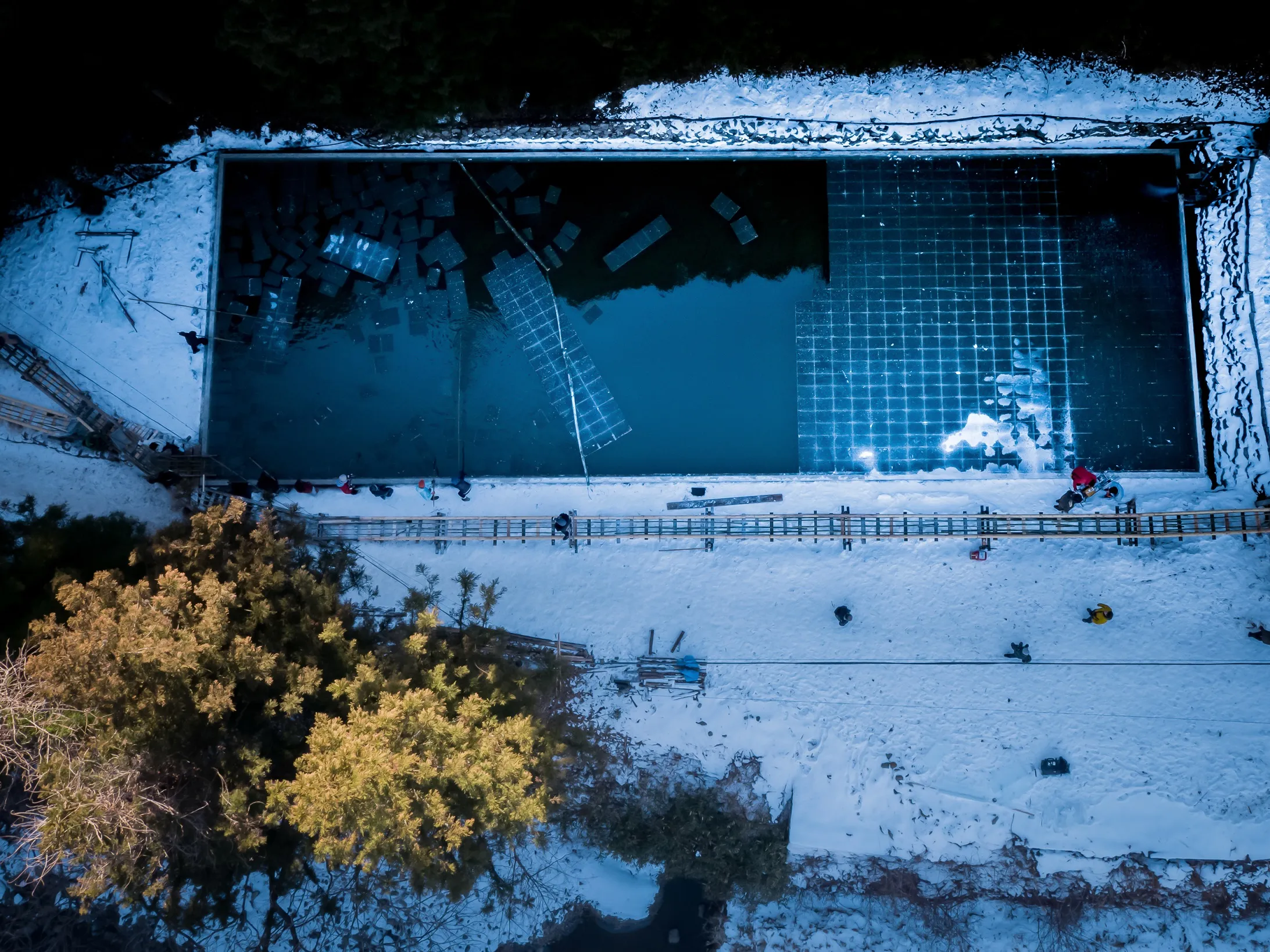 当社スタッフは、毎年1月に行われる採氷池からの氷の切り出し、氷室への搬入作業に参加し、伝統ある天然氷について知識と経験を得ています。