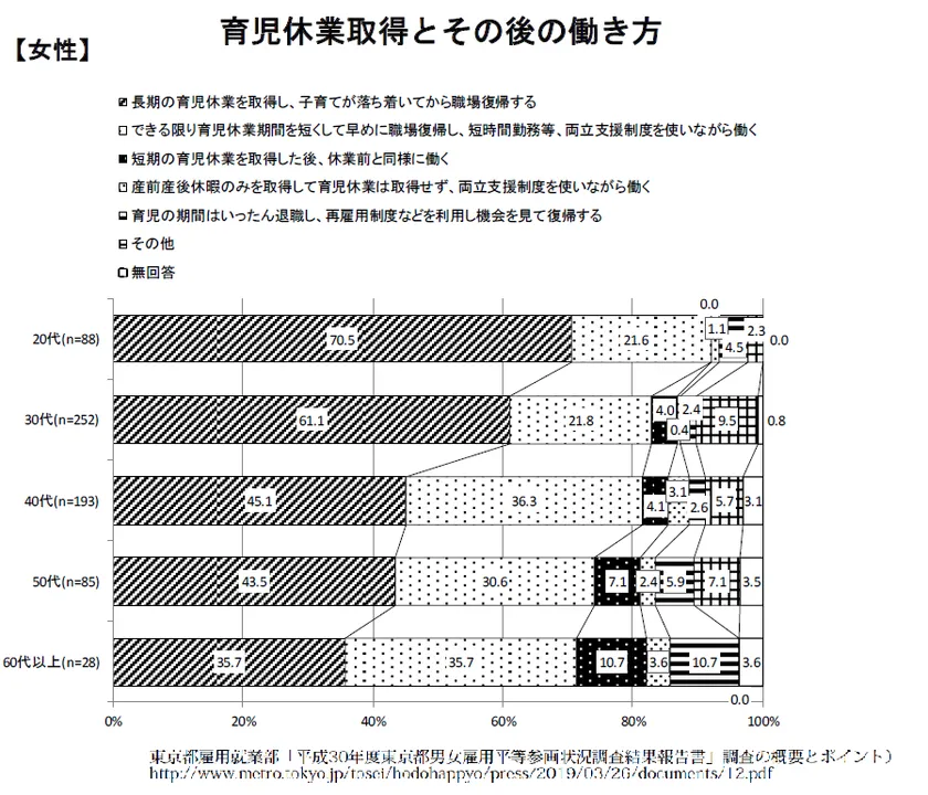 平成30年度東京都男女雇用平等参画状況調査結果報告書「改正育児・介護休業法への対応等企業における男女雇用管理に関する調査」の「従業員調査結果」によると、育児休業取得とその後の働き方について、男女とも「長期」の休業を希望する割合が最も高く(男性48.7%、女性54.3%)、若い女性ほど「長期」の休業を希望する割合が高くなっています(20代:女性70.5%、30代:女性61.1%)。