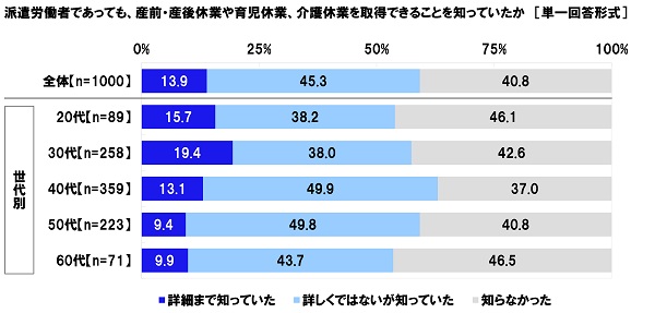 派遣労働者であっても、産前・産後休業や育児休業、介護休業を取得できますが、このことを知っていたか聞いたところ、「詳細まで知っていた」は全体で13.9%、世代別でみると、50代が9.4%と最も低く、次いで60代は9.9%、40代は13.1%でした。「詳しくではないが知っていた」も含めた認知率は、全体で59.2%となりました。