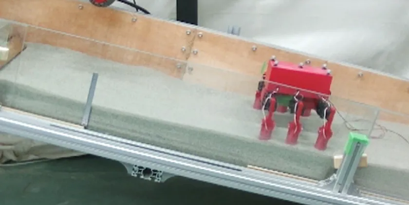 後退してしまう15°の斜面でも、振動・停止を繰り返すと 前進が可能(振動多脚ロボットの歩行実験の様子)