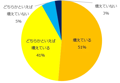 プロ人材の募集経験を伺ったところ、42%が「ある」と回答しました。また、募集案件増加の実感有無を伺うと、92%が「増えている」(増えている:51%、どちらかと言えば増えている:41%)と回答しました。