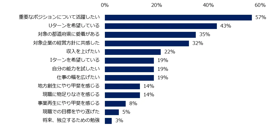 具体的な応募動機は、第1位は「重要なポジションについて活躍したい」(57%)、第2位は「Uターンを希望している」(43%)、第3位は「対象の都道府県に愛着がある」(35%)でした。重要なポジションでの仕事を希望しているだけではなく、地方で働くことをポジティブに捉えていることが読み取れます。