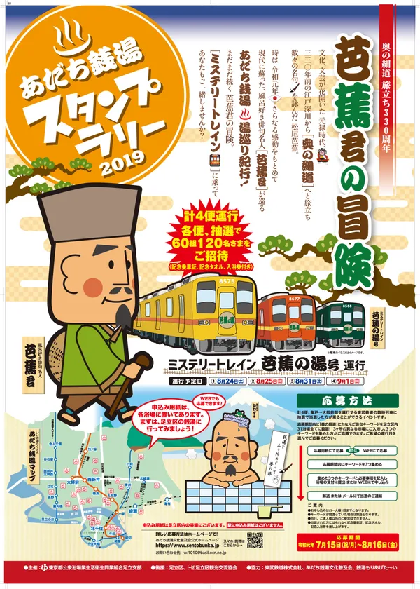 3カ所の異なる銭湯に入浴して、計3つのキーワードを集め応募する「あだち銭湯スタンプラリー2019」では、当選者は東武鉄道が特別運行するミステリートレイン「芭蕉の湯」号に乗車できます。