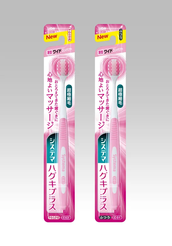 そしてこの度、幅広ヘッドはそのままに、お口の小さな女性でも使いやすいよう、ヘッドサイズを一回り小さくした『システマ ハグキプラス ハブラシ ワイドコンパクト』を新発売いたします。