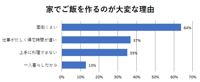 この調査では、約80%の人が「家でご飯を作るのが大変だと感じている」ことが分かりました。その理由として、面倒くさい(約64%)、仕事が忙しく帰宅時間が遅い(約37%)、上手に料理できない(約35%)という理由が上位に挙がるなど、様々な理由から家でご飯を作るのが大変だと感じている現代人が非常に多いということが分かりました。