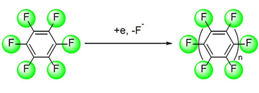 ●特別な触媒や脱離基を必要とせず、ヘキサフルオロベンゼンを電解還元することで炭素-フッ素結合が還元的に開裂し、ペルフルオロポリフェニレン(完全フッ素化導電性高分子)を簡易に合成可能