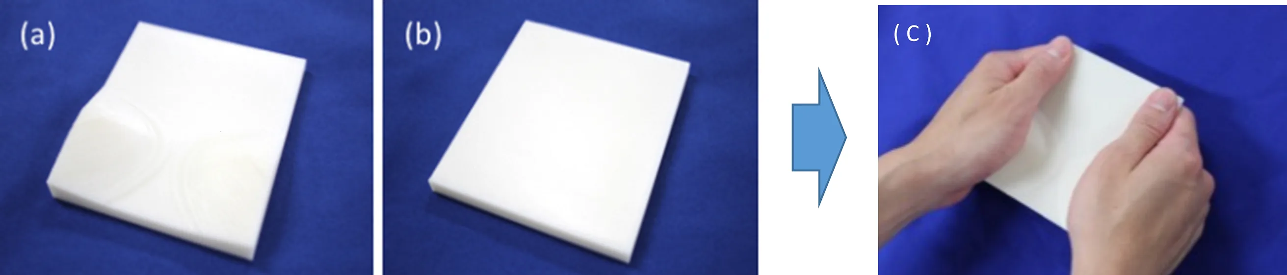 被験者には、視覚・聴覚情報の影響を抑えるために、アイマスクとヘッドホンを装着してもらい、プレートを(c)に示すように持っていただき、(a)(b)の指先部分の厚さ比較を実施した。