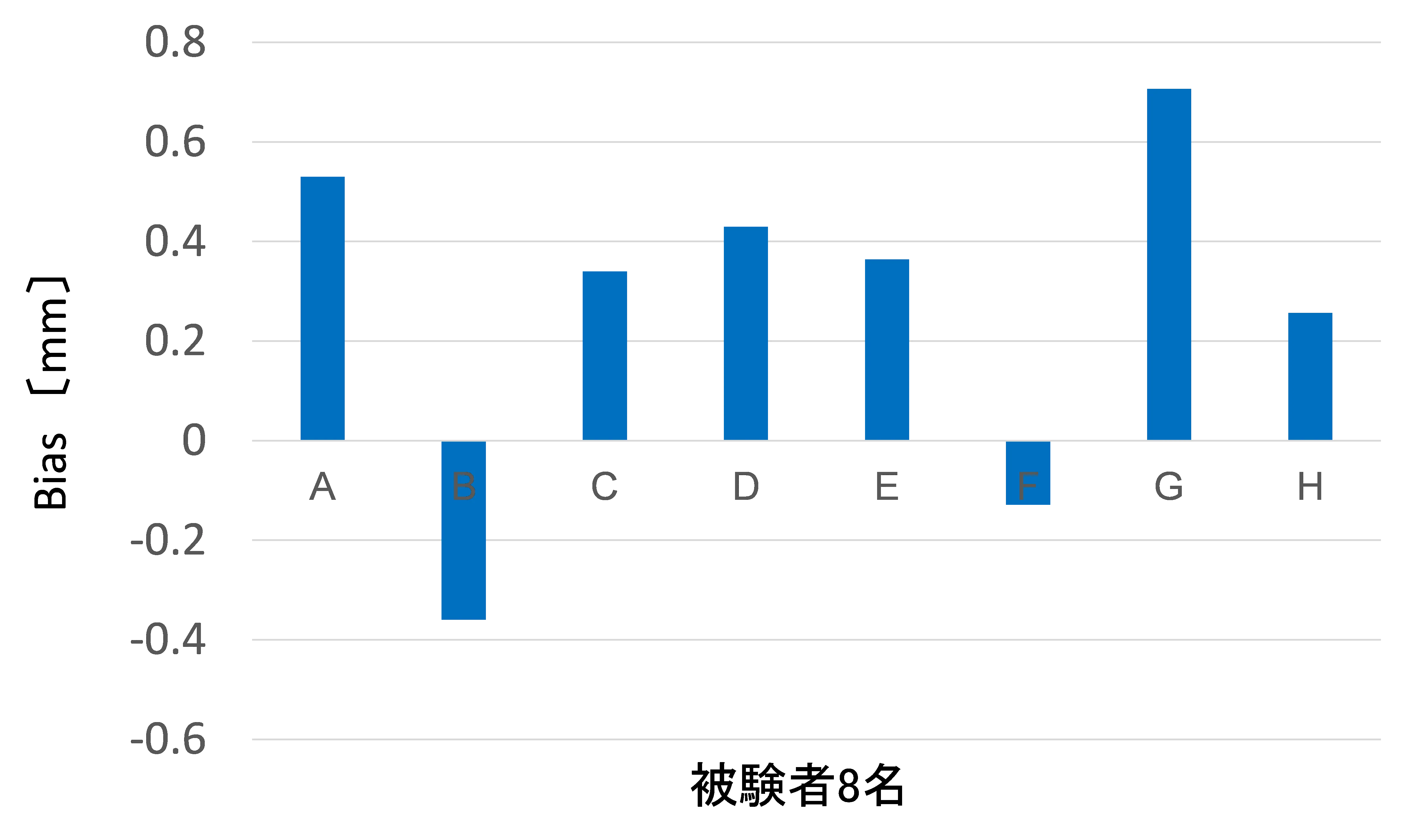 被験者ごとの、基準厚さ(5mm)に対する厚さ知覚のバイアスを平均すると隆起のある(a)プレートの方が、隆起のない(b)プレートよりも約0.27mm、厚く感じることがわかった。