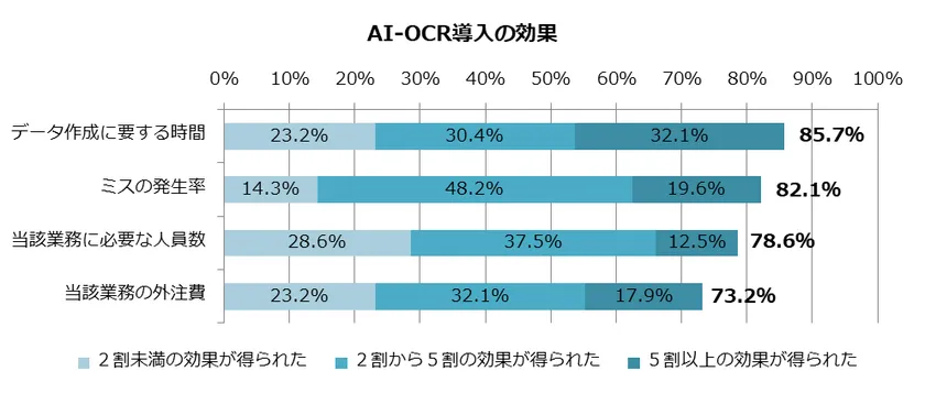 一方、導入企業のうち85.7%が「データ作成に要する時間を削減できた」と回答。82.1%は「ミスの発生率」を、78.6%は「当該業務に必要な人員数」を改善できたと回答しました。普及率はまだ低いものの、導入した企業には高い満足度を得ています。