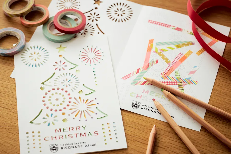 花火とクリスマスツリーをデザインした、本イベントオリジナルのクリスマスカードです。マスキングテープや色鉛筆を使って、世界に一つだけのカードを作ることができます。