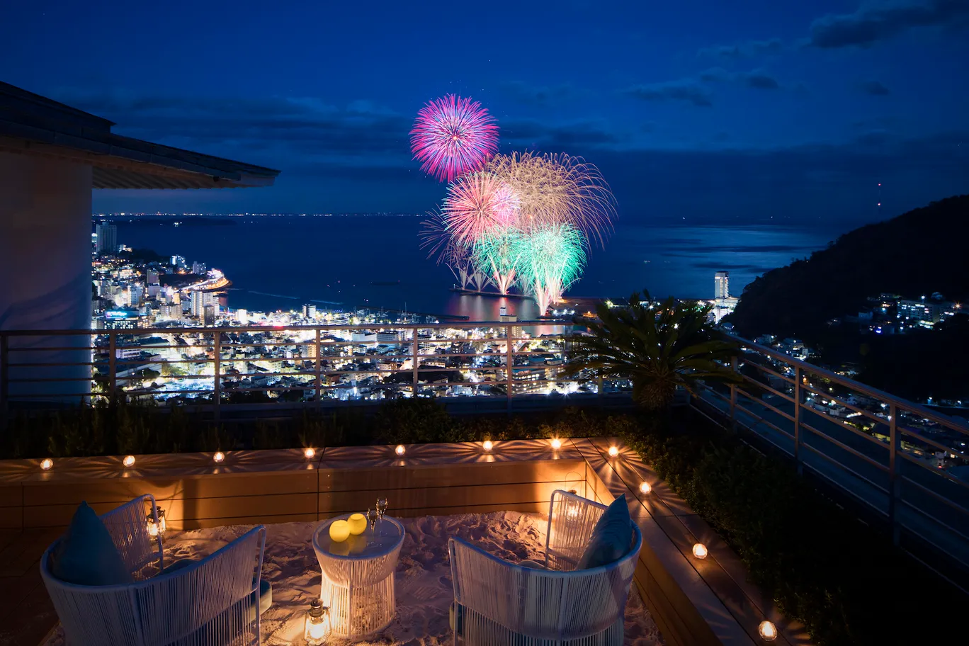 2011 年 12 月に開業した熱海の山上の地に佇む全室オーシャンビューのリゾートホテル。スタイリッシュな空間デザインに加え、相模湾と熱海の街並みを一望する絶景が魅力。熱海の花火や夜景を存分に楽しめる環境が整う。