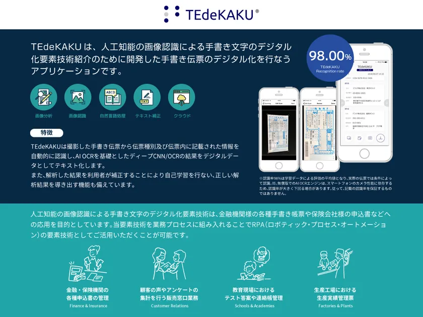 TEdeKAKUは、画像認識に人工知能を活用した無料でご利用頂ける手書き伝票解析のデジタルソリューションです。