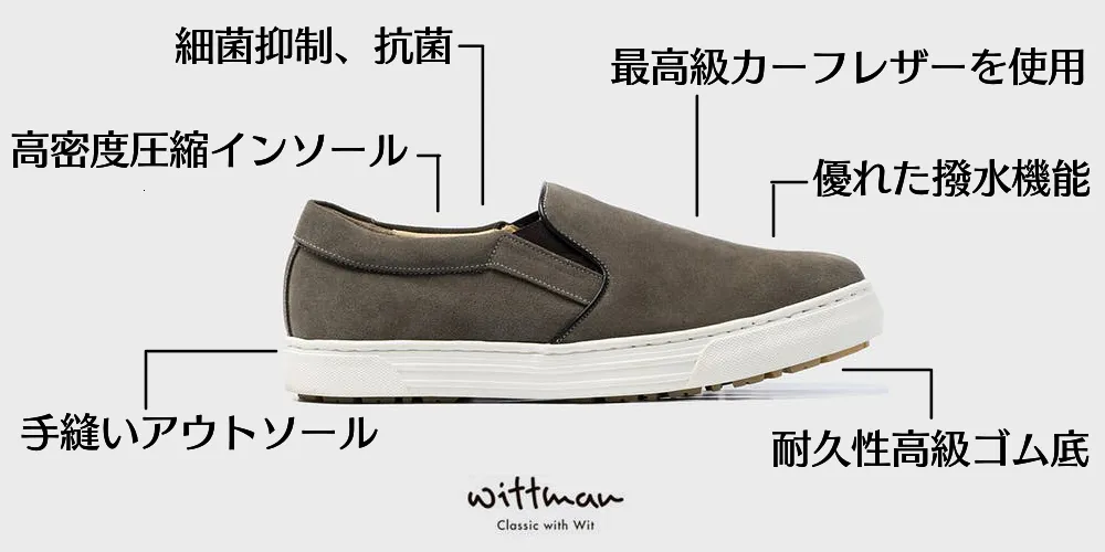 最高級防水カーフレザー採用、雨でも安心の「超撥水スエードスリッポンWittman」 疲れにくい高密度圧縮インソール、高級ゴム底で床滑り防止!