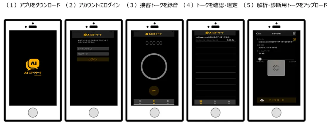 これまでは、本サービスのユーザーは、専用のボイスレコーダーで接客トークを録音していました。ユーザー側の利便性とサービス提供の効率性を図るべく、アプリ開発を行いました。この度、リリースしましたアプリは「AIスマートトーク」専用のレコーダーです。接客トークの録音からアップロードまで、このアプリひとつで完結します。スマートフォンやタブレット端末を持っている接客販売スタッフは、本アプリをインストールすれば、接客トークの録音から、解析・診断用トークの確認、選定、アップロードが簡単になり、適切なトーク時間と質の良い音源をピックアップすることができます。