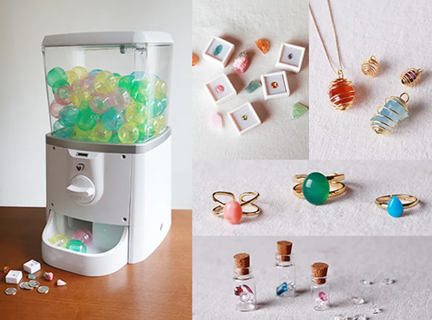 きらきらと輝く石から、宝石の素の形や表情を楽しめる原石もある、なにが出てくるかお楽しみのガチャガチャはなんと1回500円!