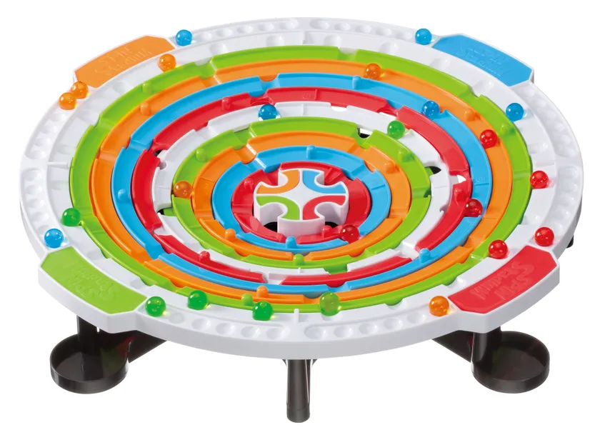 『スピンスタジアム』は、すり鉢状のゲーム盤にある9つのリングを回してボールを移動させ、途中の「ピットフォール(落とし穴)」を避けながら、ゲーム盤中央のゴールを目指すゲームです。