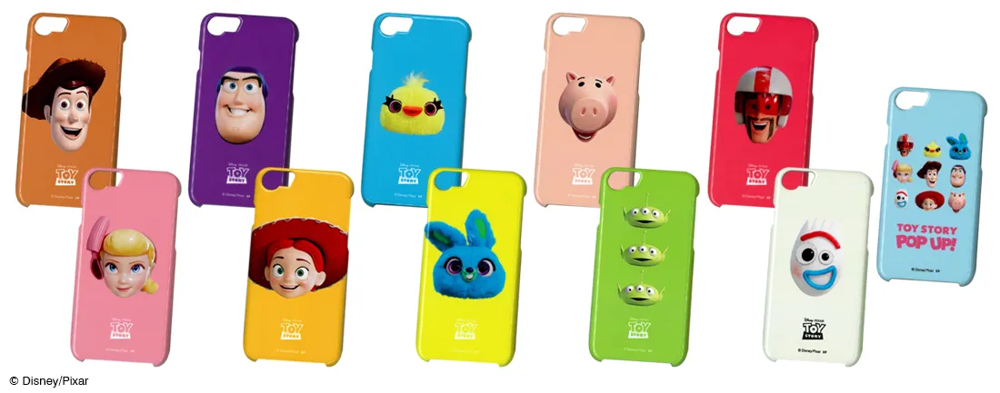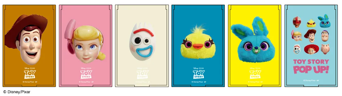 メインビジュアルに使用している、3Dキャラクターフェイスを並べたアートは、「TOY STORY POP UP!」限定なっており、その中でも特にパッチリ開いた目が可愛い「ダッキー」「バニー」は「TOY STORY POP UP!」の為にピクサー社が特別に製作したものです。このアートを使用した商品やノベルティは「TOY STORY POP UP!」以外では手に入りません。