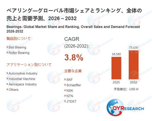 QYResearchが発表した新たな市場調査レポート「ベアリング―グローバル市場シェアとランキング、全体の売上と需要予測、2026~2032」によると、世界のベアリング市場規模は2025年の約58580百万米ドルから2026年の60570百万米ドルへと順調に拡大すると見込まれ、予測期間中は年平均成長率(CAGR)3.8%で成長し、2032年には75630百万米ドルに達すると予測されている。