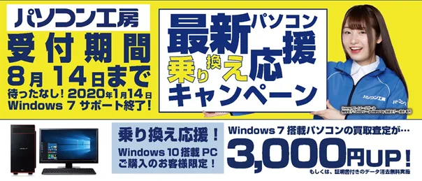 パソコン工房・グッドウィルを運営する株式会社ユニットコム(代表取締役:端田 泰三、本社:大阪市浪速区)は、全国のパソコン工房・グッドウィルの店舗、インターネット通販。法人営業部にて、2019年8月14日(水)までの期間限定で、Windows 7からWindows 10への乗り換えの際、Windows 7搭載パソコンの買取査定が3,000円増額、または、証明書付きのデータ消去サービスが無料となる下取りキャンペーン『最新パソコン乗り換え応援キャンペーン』を開始いたします。