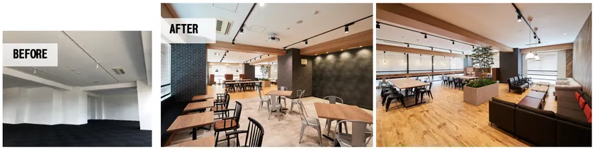 これまで、ビル敷地内で入居者が飲食や打ち合わせ等ができる場所に限りがありました。当社は、入居者のニーズに応え、入居者が快適に働くサポートとなるような空間をつくるため、もともとオフィスであった区画の共用スペースへのリノベーションを提案しました。