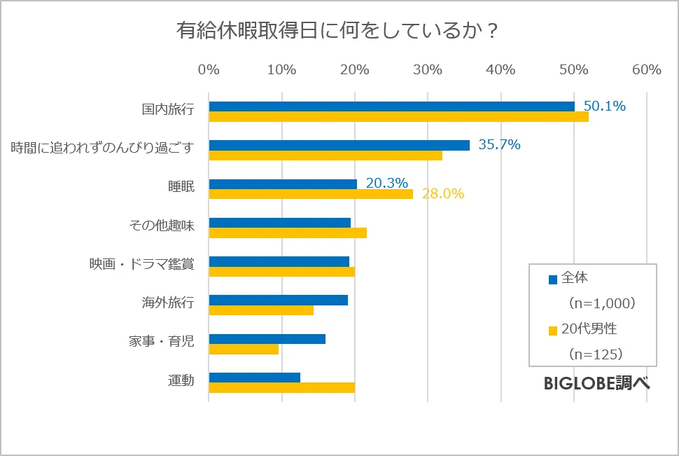 「有給休暇取得日に何をしているか」を質問したところ、「国内旅行」が50.1%で最多。続いて「時間に追われずのんびり過ごす」(35.7%)、「睡眠」(20.3%)となった。なお、20代男性は「睡眠」が28%と相対的に高い数値となった。