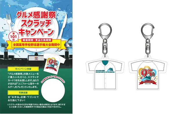 95周年記念グルメの発売に合わせてキャンペーンを実施します。対象メニューを購入いただいた方に、1商品につき1枚スクラッチカードをお渡しし、当たりが出ればユニフォーム型キーホルダーをプレゼントします。なお、景品引換店舗は全ての「お弁当」店舗及びワゴンです。