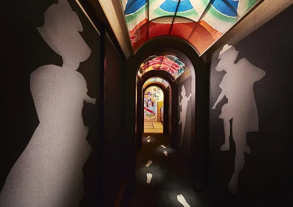 客室のねぶたの全体テーマは「古代東北の歴史」。東北の地で語り継がれる3人の英雄、坂上田村麻呂(さかのうえのたむらまろ)、阿弖流為(アテルイ)、源義経の伝説を題材にしています。玄関から主室、寝室にいたるまで、ねぶたの迫力を感じられる客室です。