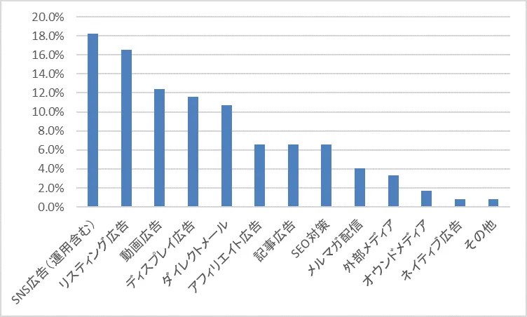 また、オンラインで実施しているプロモーションについて複数回答で質問したところ、「SNS広告(運用含む)」(34.2%)、「リスティング広告」(32.2%)、「ディスプレイ広告」(30.8%)の順で、運用型広告が上位3位に続く結果となりました。あわせて、なんらかのプロモーションを実施している回答者へ、オンラインで最も効果が良いと感じられたプロモーションを聞いたところ、「SNS広告(運用含む)」(18.2%)がトップとなり、フリーコメントより「最近はSNSが良い」といった従来の運用型広告とは異なり、新たに効果が出ているプロモーションであることが明らかとなりました。