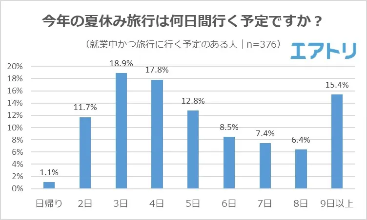 1位は「3日」(18.9%)、2位は「4日」(17.8%)となり、約半数の49.5%が「4日以内」と回答しました。「夏休みの動向調査」※1では連休が「9日以上」と回答した人が約半数の48.3%でしたが、夏休み旅行を「9日以上」する人は15.4%となっており、多くの人は全ての日数を旅行に使うのではなく、何日かは休息や別の用事にあてがっているようです。