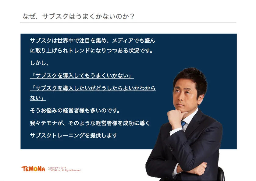 サブスクリプションビジネス支援サービスを提供しているテモナ株式会社(本社:東京都渋谷区、代表取締役社長:佐川 隼人、証券コード:3985)は、2019年8月9日に、サブスクビジネス専門のトレーニング事業「サブスク始めるくん」「サブスク成功くん」を開始することをお知らせします。これからサブスクリプションビジネスに参入を考えている事業者様、既にサブスクリプションビジネスに取り組んでおり、今後さらに事業を拡大させたい事業者様に対して、効率的なサブスクビジネスの立ち上げ方、事業の成長させ方をマンツーマンでお伝えすることで、サブスクビジネスの成功確率を高めます。