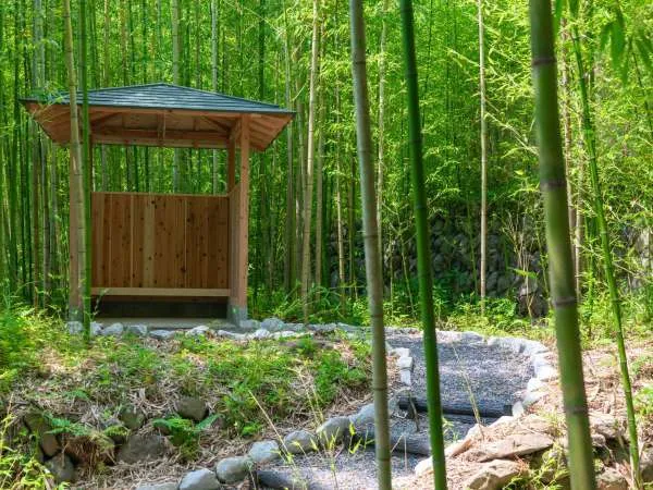 具体的には、竹林の貸切風呂近隣の土地を購入し、竹の原生林の中に約200メートルの径を設計いたしました。その道に七福神の石像を設置し、竹林を散策しながら七福神めぐりをお楽しみいただけるようにいたしました。また、散策をより長い時間お楽しみいただけるよう、竹林の径の中に『休憩所』を設計いたしました。