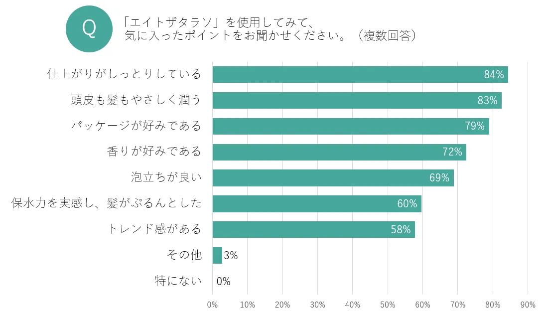 そこで今回は実際に、ヘアケア分野の『細胞美容』アイテムである新シャンプー「エイトザタラソ」を美容フリークたちに使用いただきました。まず、「商品のどのようなところに興味を持ちましたか?」と聞いたところ、「“美容液シャンプー”という機能面」(89%)、「“幹細胞成分”*1配合のヘアケア」(84%)、「“ぷるん髪”になるという仕上がりイメージ」(82%)などが上位に。『細胞美容』を取り入れたヘアケアアイテムであることだけでなく、機能面や仕上がりに興味を持つ人が目立ちました。