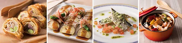 (左から)鶏肉と砂ずりのコンフィじゃがいもと茸のパイ包み焼き(土日祝ディナー限定)、豚バラ肉とさつまいも、長芋の重ね焼き、秋刀魚の香草パン粉焼きバルサミコの香りのフレッシュトマトソース、豚ロースのデミグラスソース煮込みポルチーニの香り