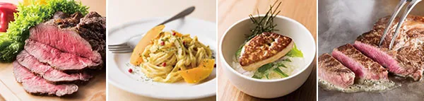 (左から)ローストビーフ(ランチ限定)、かぼちゃのクリームパスタ(ランチ限定)、フォアグラ丼 和風ソース(ディナー限定)、ビーフステーキ(ディナー限定)