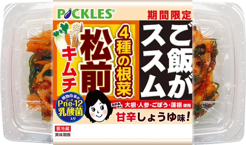 毎年ご好評いただいている「ご飯がススム 松前キムチ」がさらにおいしくリニューアルいたします。4種の根菜と昆布、スルメイカを使用した和風のキムチです。たまり醤油と和風だしがきいた甘辛しょうゆ味でご飯によく合います。当社独自の植物性乳酸菌Pne-12(ピーネ12)を配合しています。9~2月までの季節限定商品です。