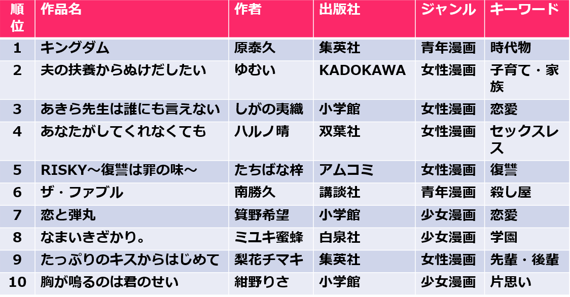 「めちゃコミック」の7月度の人気ランキングは以下の通りです。