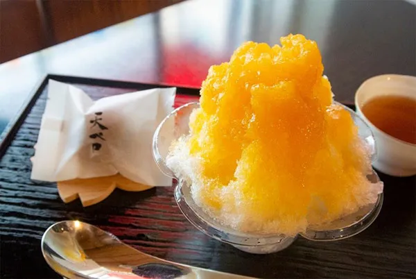 完熟マンゴーの柔らかく滑らかな食感と甘酸っぱさをそのままソースにしました。さわやかな口当たりで、夏の暑い日にぴったりのかき氷です。