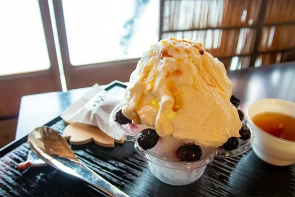 リコッタチーズをムース状にしたエスプーマをタップリかけました。低脂肪でさっぱりとした甘みがかき氷と絶妙にマッチします。ブルーベリーをそえてお召しあがりください。