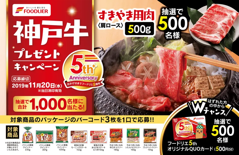 キャンペーン期間中に、対象商品いずれかのバーコード3枚を1口で応募すると、神戸牛すきやき用肉肩ロース500gが抽選で500名様に当たります。