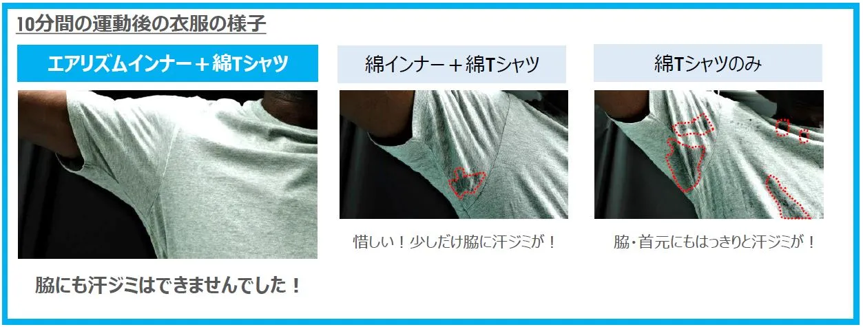 結果1:綿インナーでは防ぎきれなかった汗ジミを、エアリズムでは防止することができた。