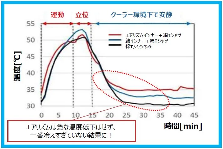 すると、右図の通りエアリズムを着用した場合は、急激な温度低下が抑制されており、綿インナーや綿Tシャツと比較してもエアリズムが一番冷えすぎていないことも分かりました。