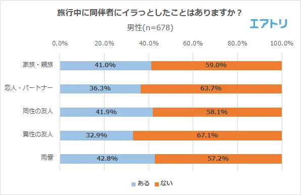 男性は「同僚」(男性:42.8%、女性:38.0%)との旅行の際にイラっとしたことがある人の割合が最も多く、女性は「家族・親族」(男性:41.0%、女性:59.8%)の割合が最も多くなりました。「恋人・パートナー」(男性:36.3%、女性:50.3%)と「同性の友人」(男性:41.9%、女性:53.6%)においても、イラっとしたことがあると回答した女性が過半数となり、男性の回答よりも10ポイント以上多い結果となりました。