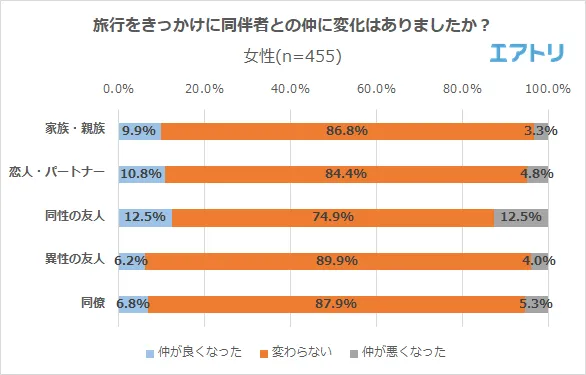 女性は家族・親族、恋人・パートナー、同性の友人との旅行で「仲が良くなった」人は各1割前後となり、「同性の友人」(12.5%)が最も高い割合となりました。一方で女性が「仲が悪くなった」との回答が最も多かったのも「同性の友人」の12.5%となり、仲が良くなる割合と同率となりました。