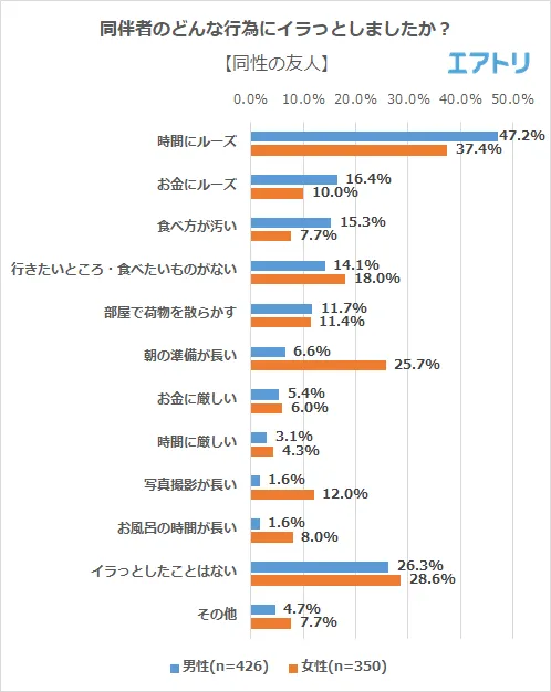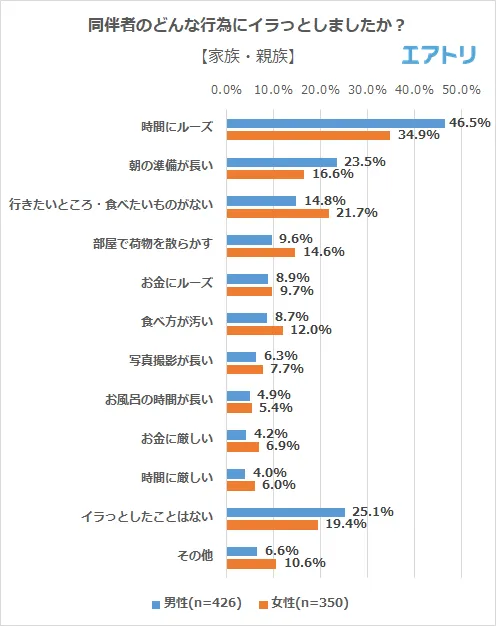 旅行同伴者にイラっとする行為「朝の準備が長い」を抑え「時間にルーズ」が1位 男性は「同僚」、女性は「家族・親族」との旅行でイラっとする事が多い傾向に