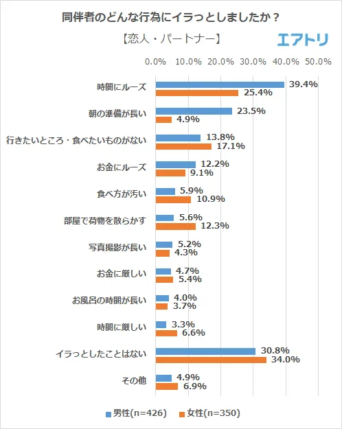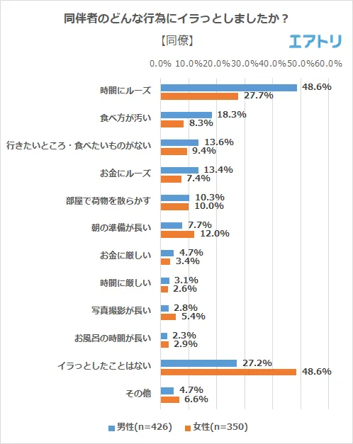 旅行中に同伴者(家族・親戚、恋人・パートナー、同性の友人、異性の友人、同僚)のいずれかにイラっとしたことがあると回答した人に、どんな行為にイラっとしたか聞いたところ男女ともにどの同伴者も「時間にルーズ」が1番多い回答となりました。