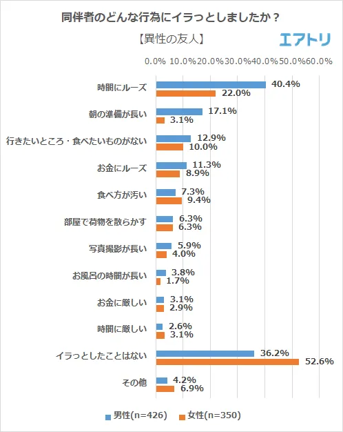 ―家族・親族、恋人・パートナー、同性の友人、異性の友人、同僚との旅行で最もイラっとする行為は「時間にルーズ」となりました。特に男性の方が「時間にルーズな旅行同伴者にイラっとする」と回答した人が多い結果となりました。