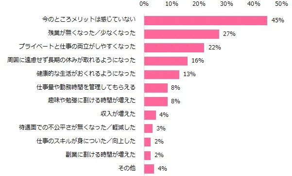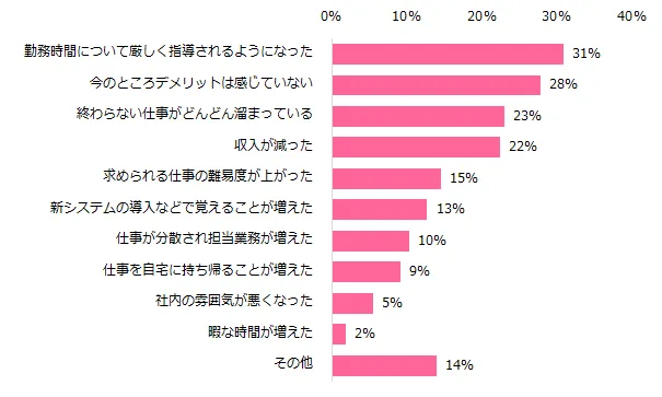 一方、感じているデメリットを伺うと、「勤務時間について厳しく指導されるようになった」(31%)が最多でした。次いで「今のところデメリットは感じていない」(28%)、「終わらない仕事がどんどん溜まっている」(23%)が多く回答されました。